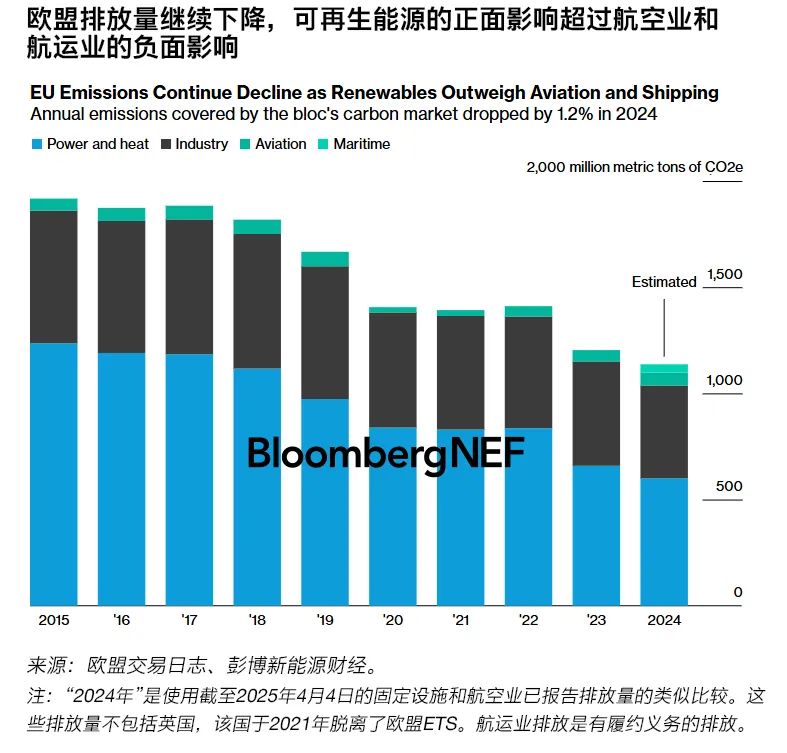2024年,即使把航运业也算在内,欧盟碳市场的排放量仍下降1.2%,而此前一年的降幅达到创纪录水平。电力行业和工业一马当先,固定设施的排放量下降5.5%。航运业去年首次纳入市场,排放量相当于9800万吨二氧化碳当量,但只有3900万吨二氧化碳当量将进行履约。与此同时,随着航空旅行继续攀升,航空业排放再次增长,增幅达到14%。
